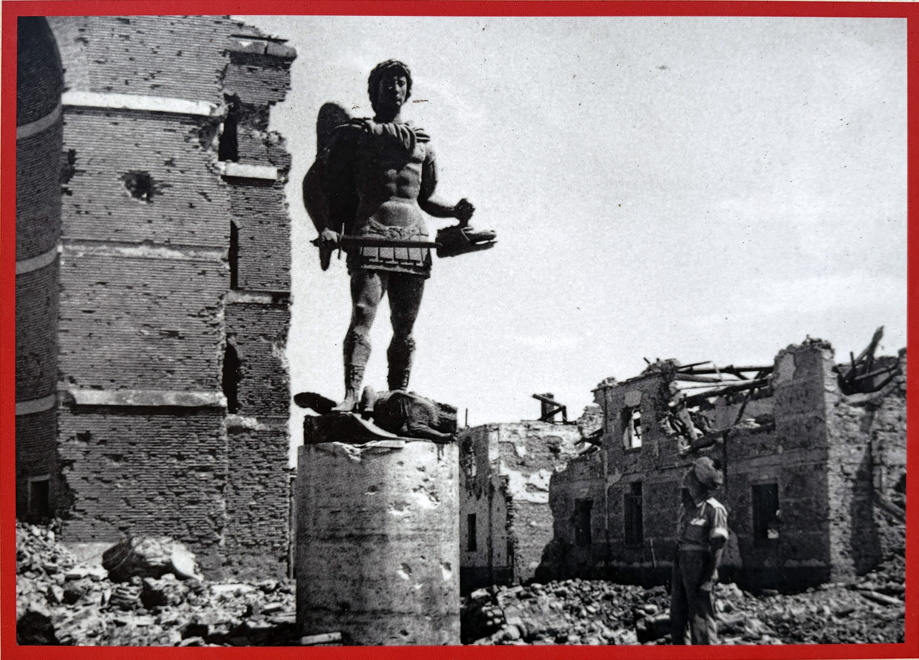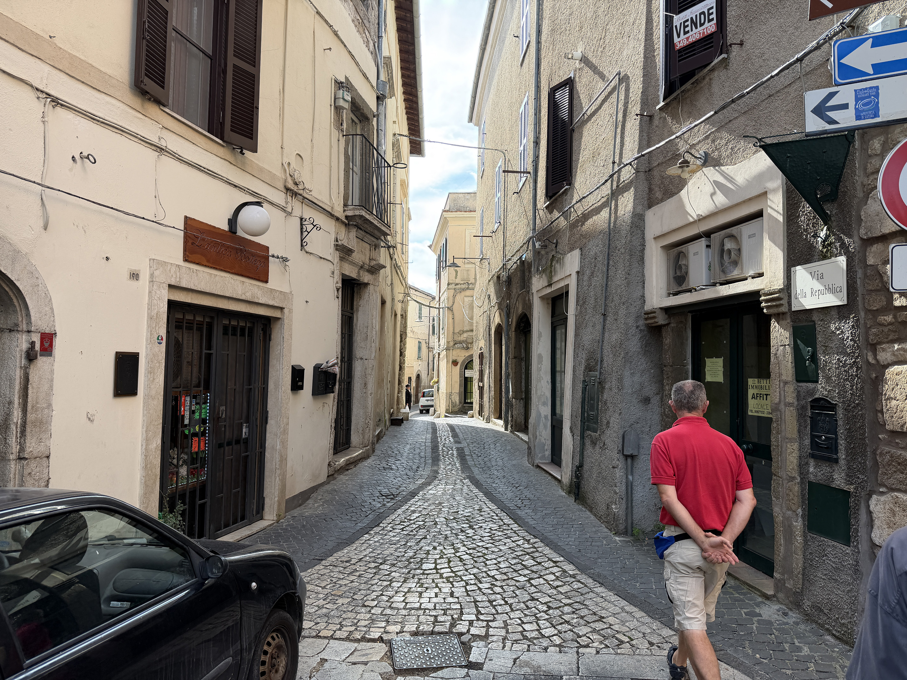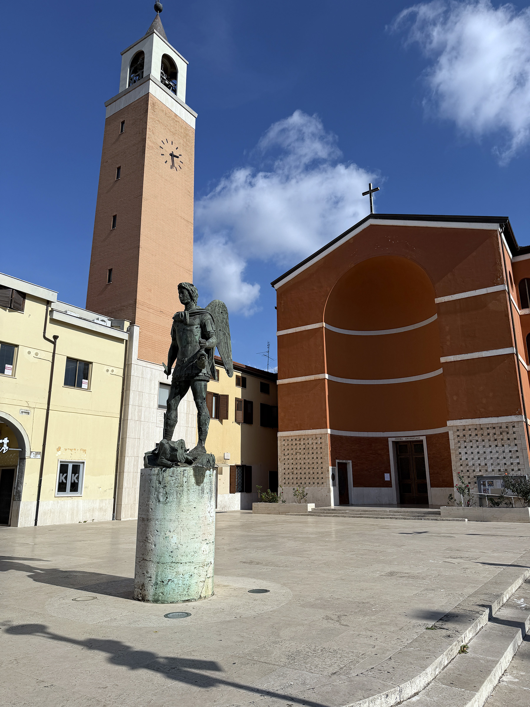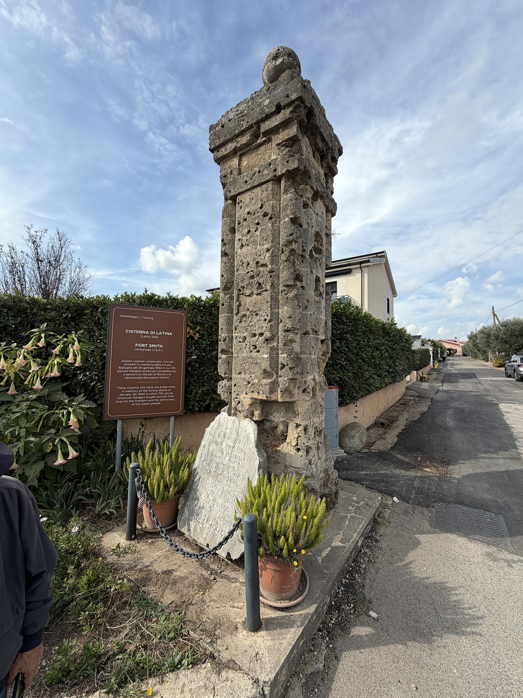 We took this opportunity for lunch and visited a large, modern shopping center that had a food court. All of us shied away from KFC and Burger King and went to Alice (ah-LEE-chay) for al taglio pizza slices. We did some exploring in Aprilia, which the Allies referred to as Aprilia Factory because of two towers that from the distance looked like they were industrial smokestacks. This was one of five fascist cities that were custom-built by Mussolini, and we found a couple of buildings that survived the destruction of war, as well as a metal statue of St. George the Dragon Slayer that was riddled with bullet holes.