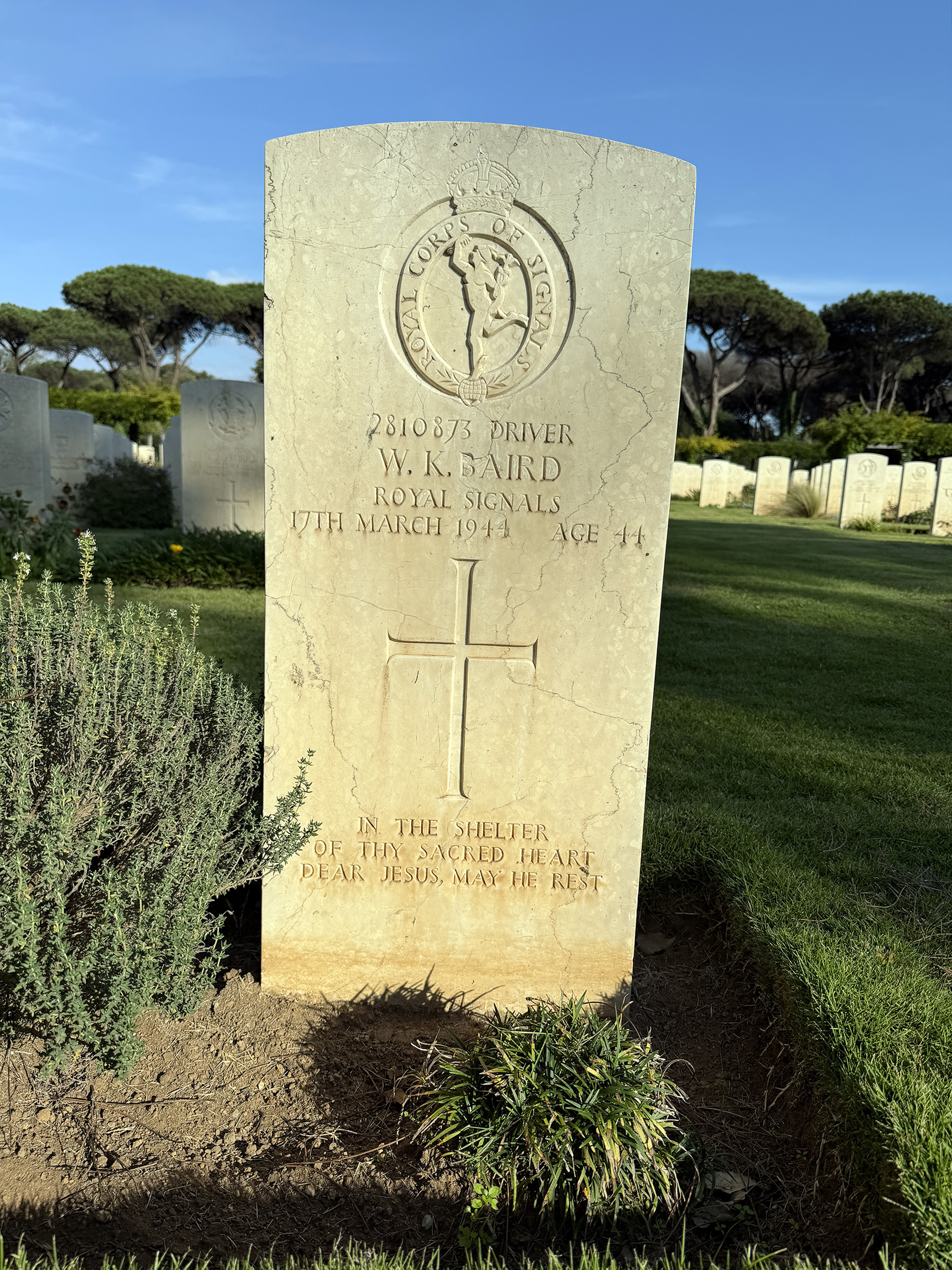 Our final stop after a long day of jumping in and out of the car all over the battlefield was a second British Cemetery, this one interring men of the 2nd Division. An interesting anomaly here is that the Royal Artillery erected an individual monument honoring about a dozen observation pilots who were killed in the area. The standards for these British cemeteries eschew any deviations from one identically designed grave marker per person. I got to see the grave of a driver in the Royal Corps of Signals, which was sentimental for me as a former U.S. Army Signal Corps officer. Their regimental crest features the god Mercury.