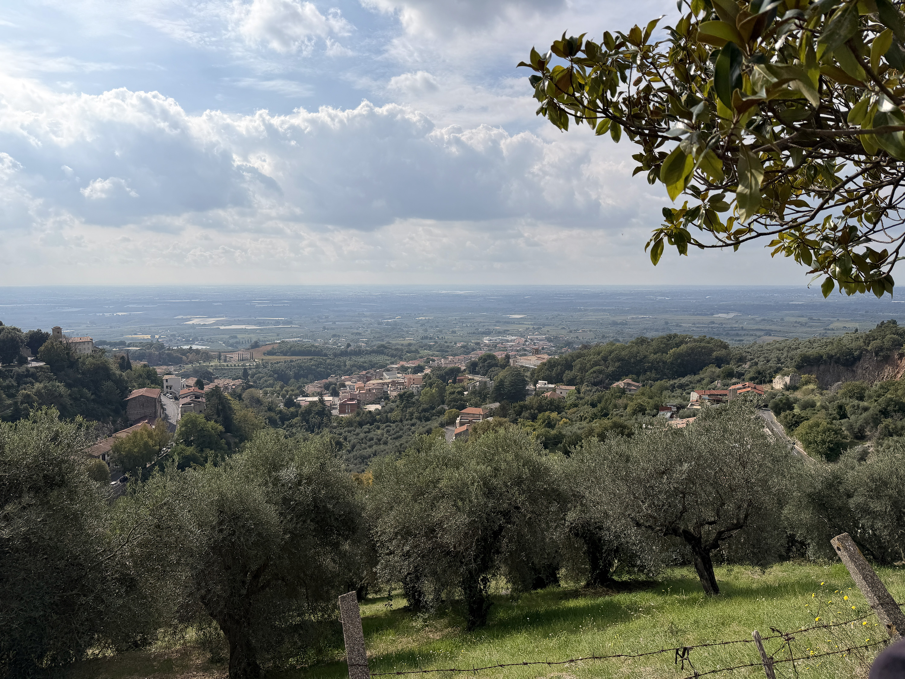 We drove partway up Lepini Mountain to the village of Cori, where we could see the entire battlefield in a grand panorama. First, we stopped for lunch in a little place called La Taverna dei Golosi, where I had a pasta dish in the style cacio e pepe, one of my favorites. We consulted battlefield maps to examine the four options that Truscott considered for breaking out of the beachhead in May. Operations Crawdad and Grasshopper were rejected. Operation Turtle was meant to push northwest around the western slope of the Albin Hills. But this was rejected because there were two German divisions stationed there on good defensive ground, the 4th Paratroopers and the 3rd Panzer Grenadiers. However, Operation Buffalo offered advantages. It was an advance due north through the Valletri Gap to seize the town of Valmontone, which would cut off Route 6 to the German 10th Army that was withdrawing from Cassino. (The breakout from Anzio was intended to be done in conjunction with the Fourth Battle of Cassino, a combination called Operation Diadem.)
