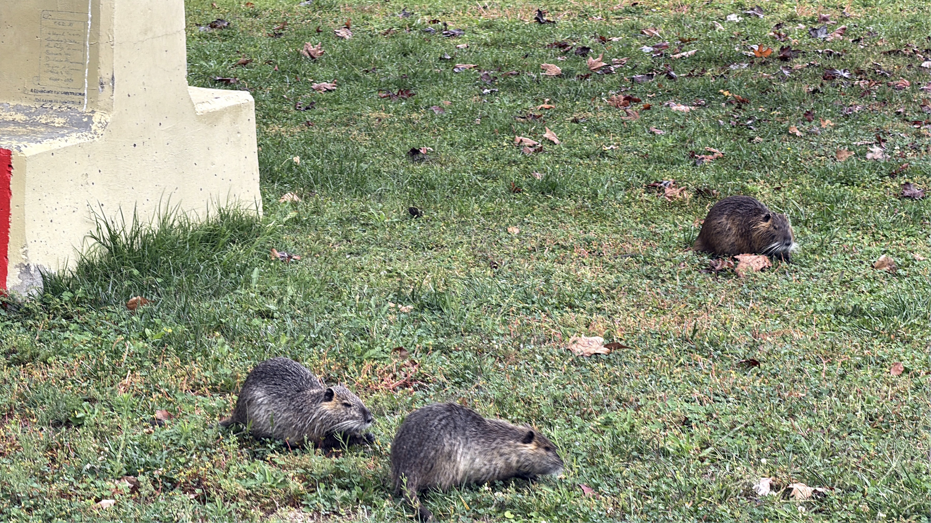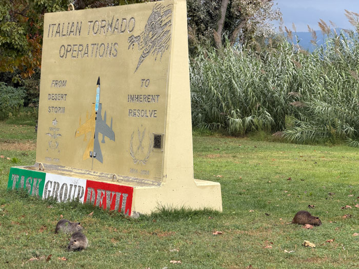 The museum exhibits are very frank about the limitations of the Italian aviation system and the Italian Air Force in World War II and up until today. They portray the military program of the 1930s as more of a jobs program than a serious effort, and they had an inability to concentrate on a few effective designs. They have a lot of information about the pioneers of Italian aviation, none of whom anyone has ever heard of. At the entrance to the museum, there is a small model of an F-35, but inside, the most recent airplanes are an F-16, a Tornado, and a Typhoon. One of the unintended highlights for me was outside on the grass where a family of nutrias were munching down frantically.