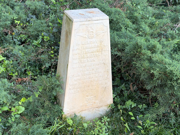 We drove to an area that was riddled with wadis, an Indian term for ravine or creek bed, in which the U.S. soldiers sought refuge during the lengthy stand-off with the Germans. Before we saw one, however, we stopped at a monument to Eric Waters, who seems to have prominence solely because his son Roger was a member of Pink Floyd. He was also mentioned prominently on the port monument we saw last night. We also saw from a distance some caves in a cliff that the 157th Infantry defended on the left-hand side of the bucket. When we finally got down into a wadi, I found it quite miserable—very deep and a terrible place to spend a number of months in the rainy season.