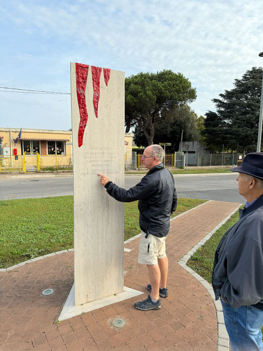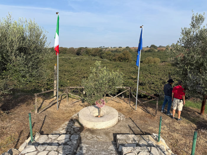 We made frequent stops along the way to highlight key landmarks and battle action, which I will not recount here. Frank pointed out the many ditches, called fossi, through which German troops would infiltrate inside and behind British units. By February 1st, the British had advanced their line into a narrow 2.5-mile salient, which Frank called a lozenge, extending to Campoleone railway station. Bletchley Park had intercepted and decrypted Enigma radio communications indicating that the Germans were planning to counterattack on February 3rd, so the British forces dug in as best they could. They were in a very difficult position because the salient would allow attacks from both sides that would cut them off.