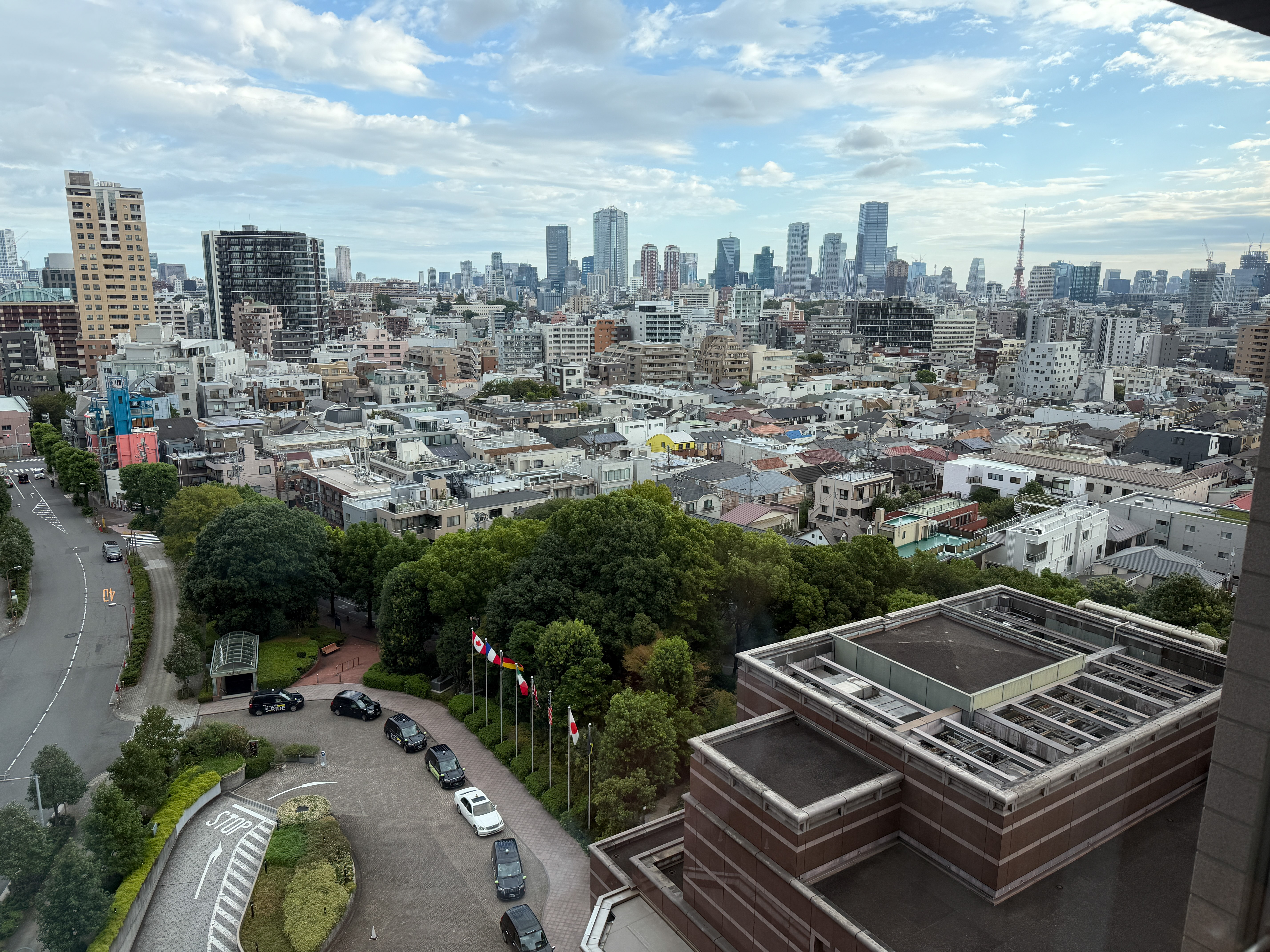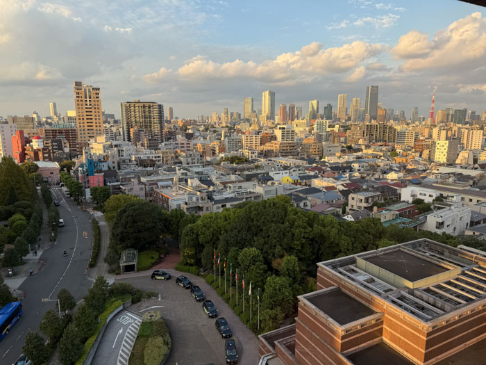 Haneda seems to be set up for massive crowds, and they handled about three plane loads at once expeditiously. The museum arranged a car service to take me to the hotel, the Westin Tokyo in the Ebisu district. The car was a Toyota Alphard minivan, which was quite luxurious. The driver was excellent, although not an English speaker. I felt bad that they don’t tip here. The hotel is quite ritzy and very comfortable, in a pleasant area with parks and a Galleria across the street. Checking some old maps, I believe this area was totally obliterated by U.S. firebombing in March 1945. I roamed around for a while looking for a light and inexpensive dinner, but this does not seem like the kind of neighborhood that hosts ramen shops and convenience stores. Not being very hungry after two substantial meals on the plane, I settled on an Okinawan ice cream cone. Even in the early evening, the weather is warm and humid. It looks like the weather forecast for the week is going to be mostly in the 80s.