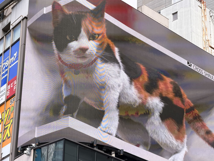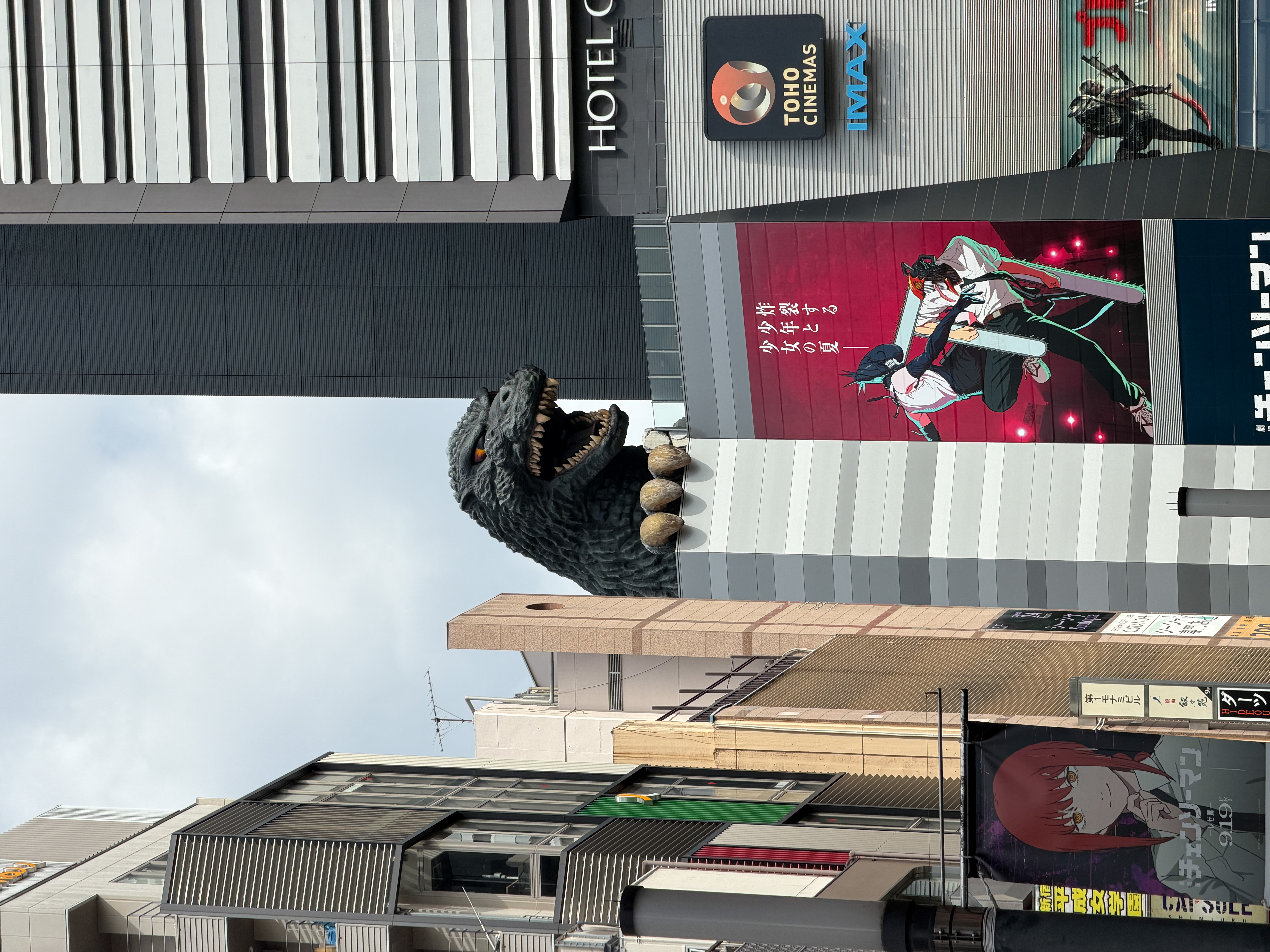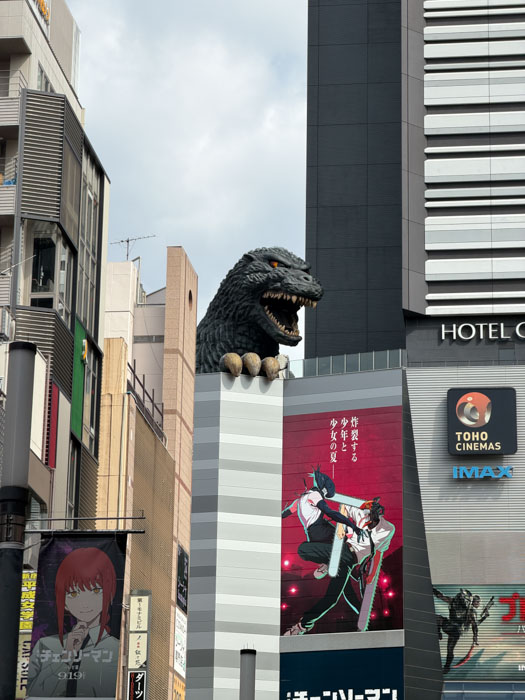 I only did a few things in the Shinjuku district. First was viewing the famous electronic billboard that shows a giant three-dimensional cat. Every video of the cat doing mischievous things was interspersed with lots of different ads and public announcements. Then I walked a few blocks to find a 12 m high head of Godzilla looming over the top of the tall Toho building. I was intrigued to hear a loud public street announcement in English warning visitors about "touts," a word I had not heard before, but I read online that tourists in Tokyo should be wary of "touts" in nightlife areas who may try to lure them into bars or restaurants with fake menus offering inflated prices, leading to scamming.