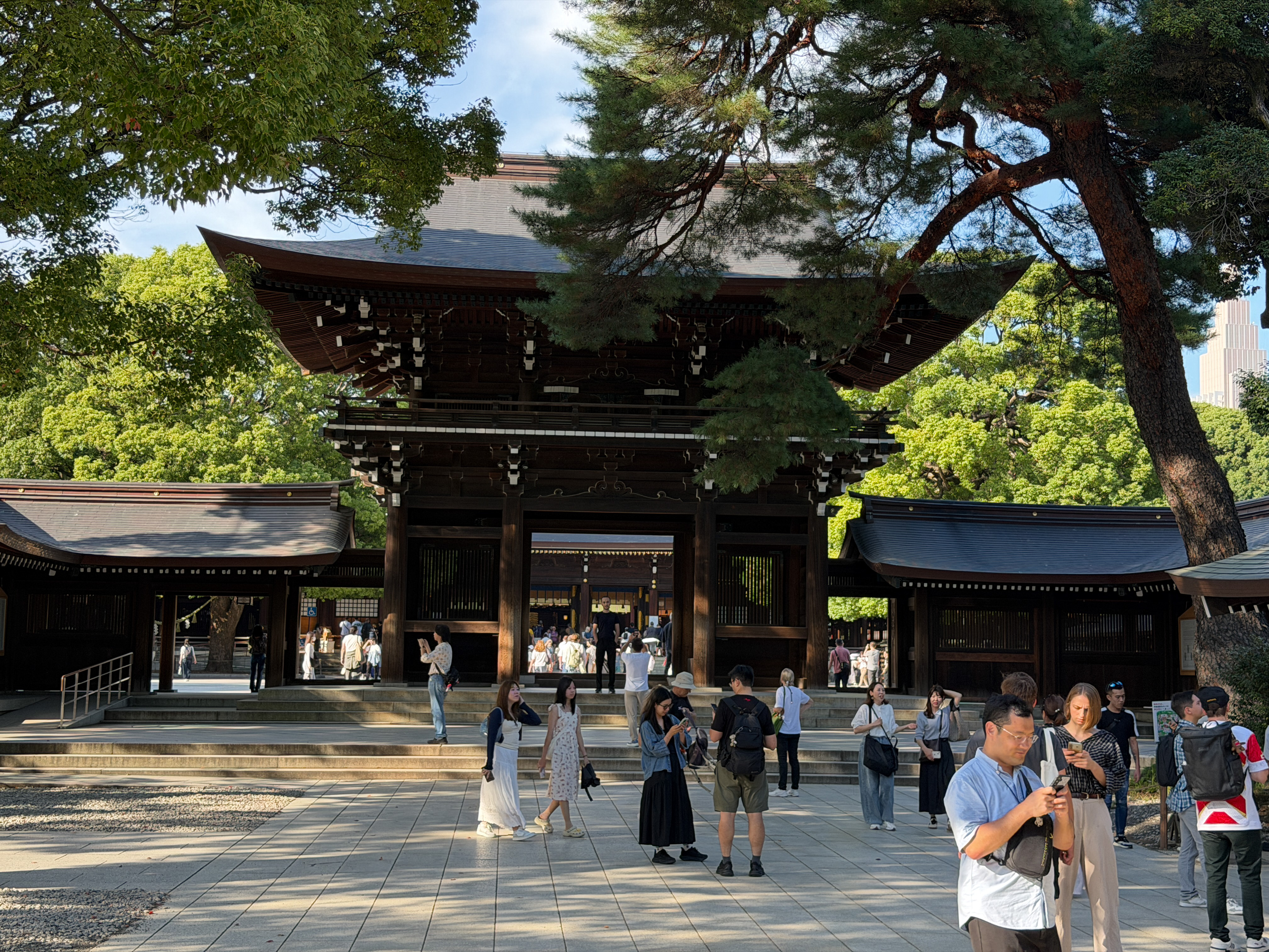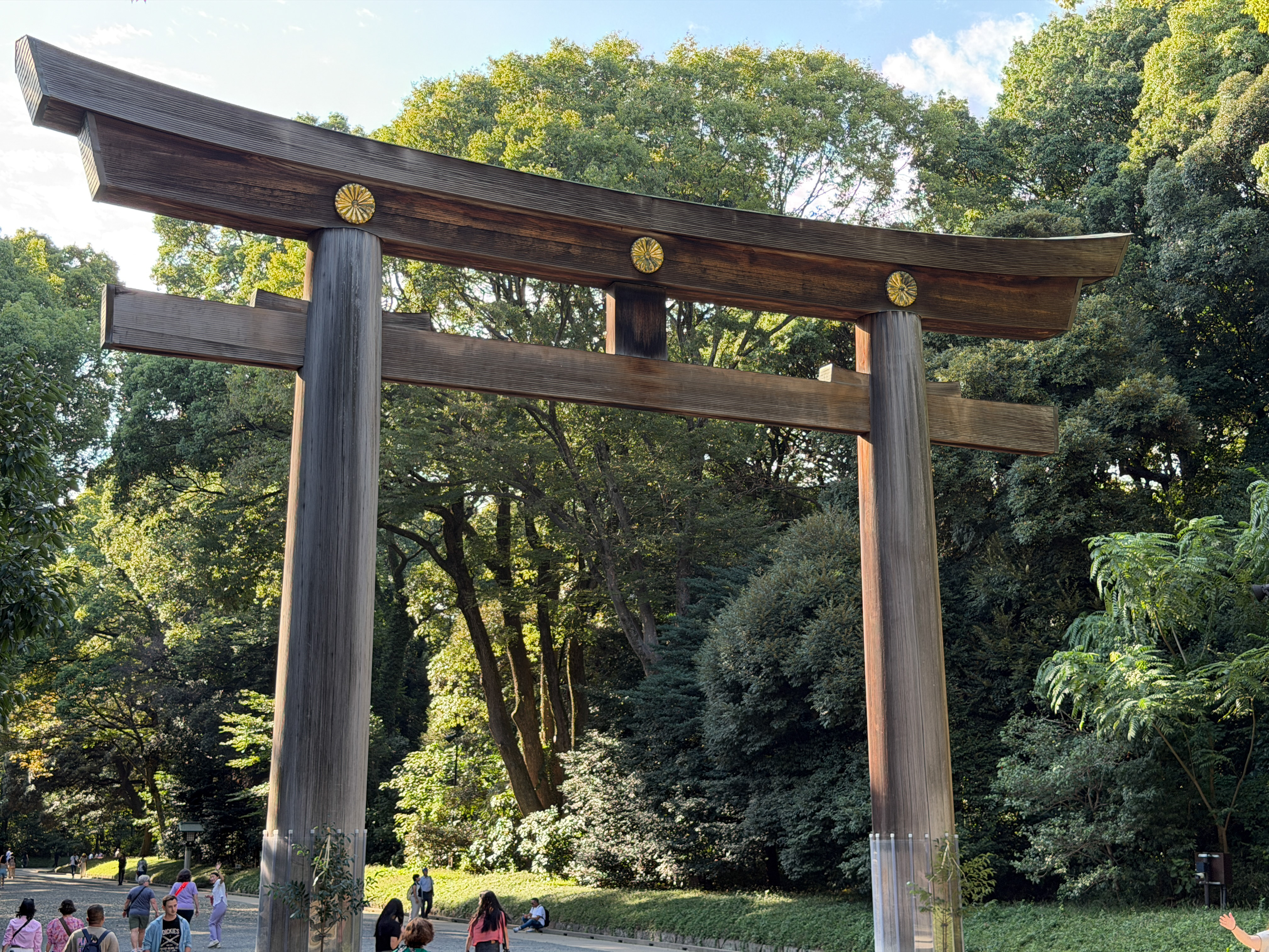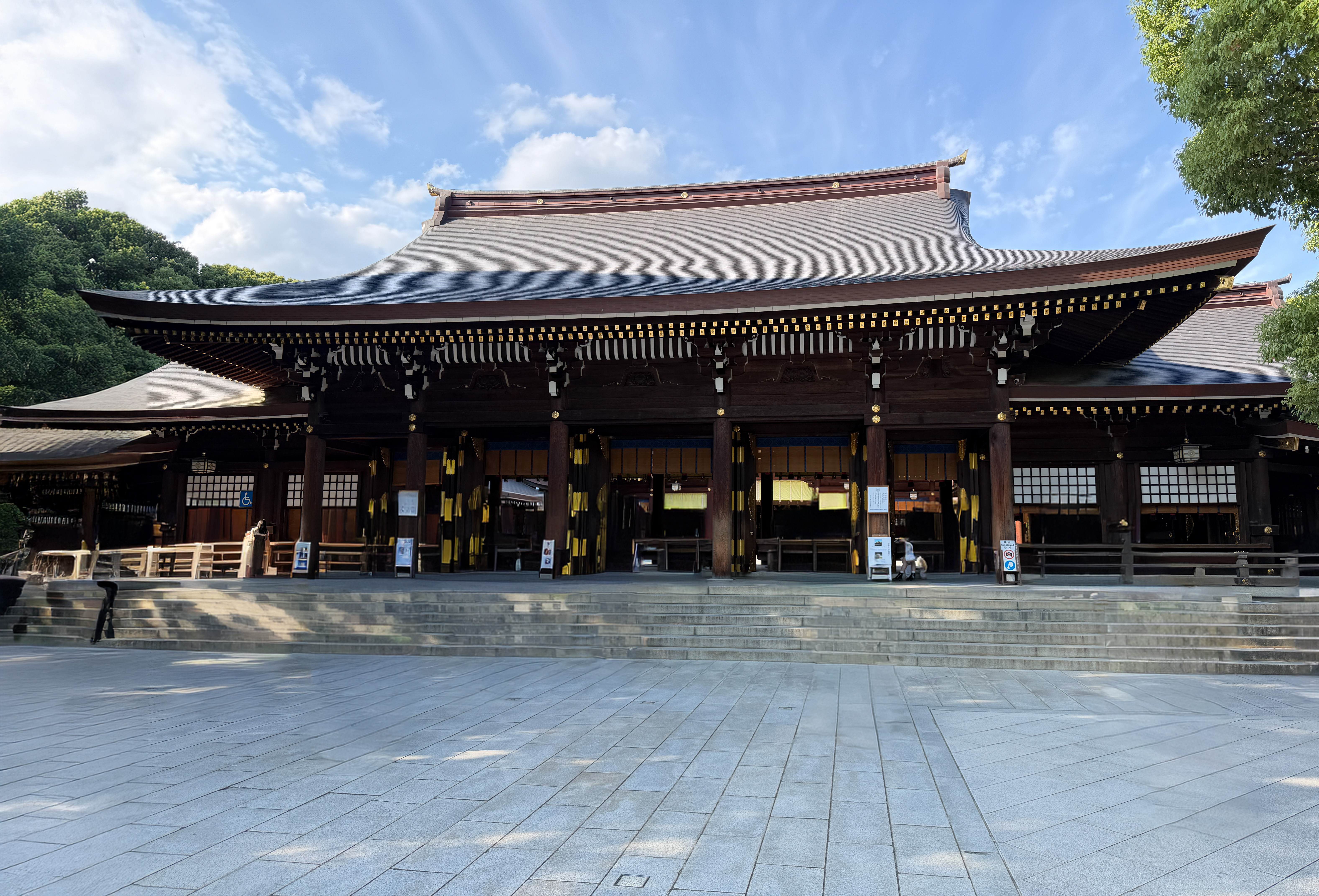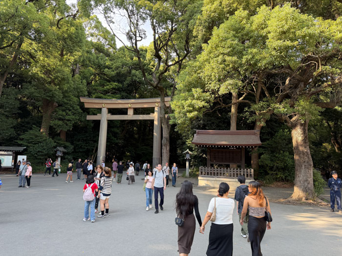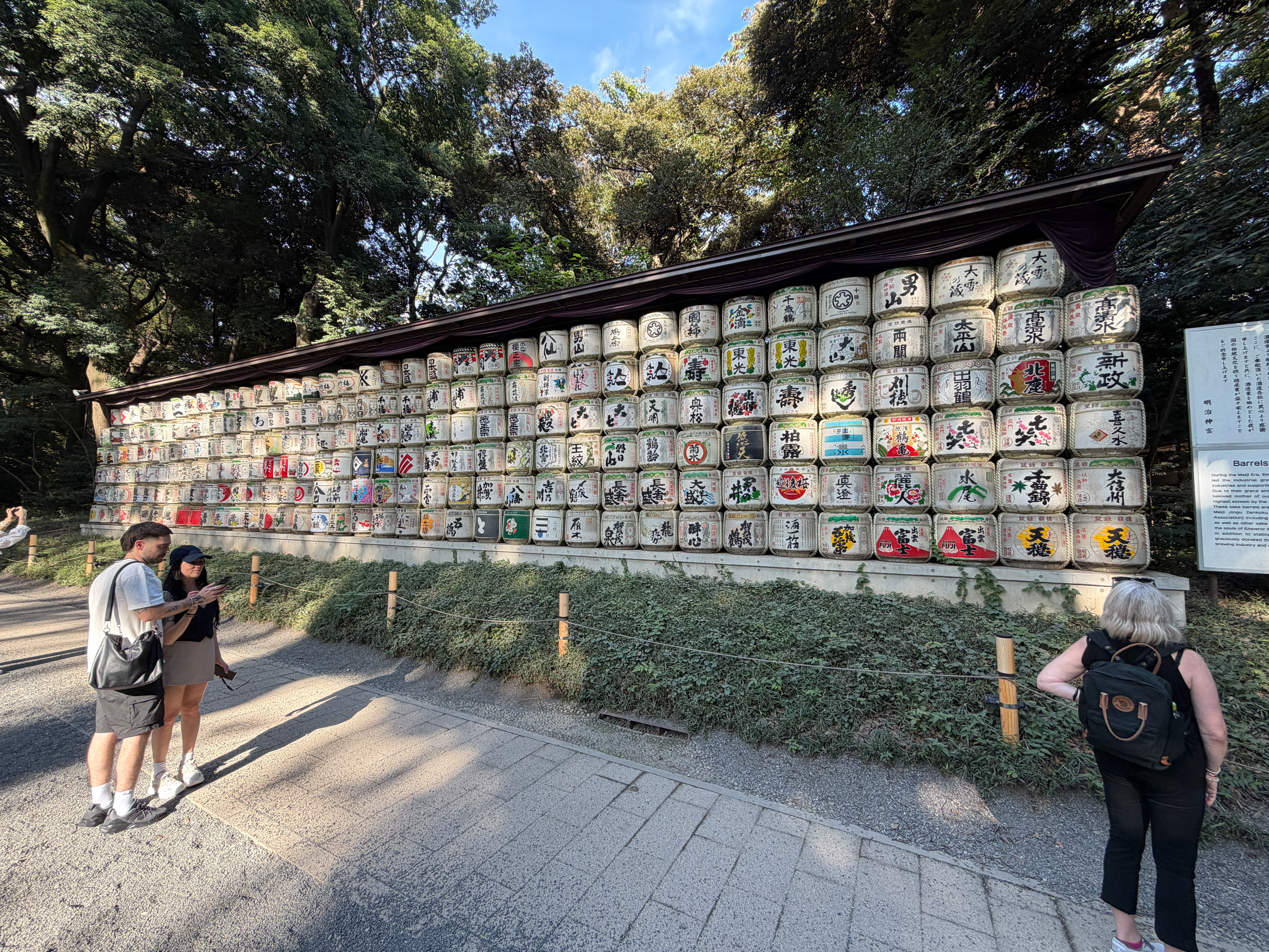 After I cooled down for a while in the hotel air conditioning, I decided I needed to get a little culture for the day. I took the train to Harajuku Station and visited the nearby Meiji Jingu Shinto Shrine. It is dedicated to the deified spirits of Emperor Meiji (died 1912) and his wife, Empress Shōken; although their souls are enshrined here, their bodies are buried near Kyoto. It is in the center of a beautiful 170-acre evergreen forest. The shrine was completed in 1920 and was destroyed during the U.S. bombing raids, but was obviously rebuilt. It is quite a lovely and peaceful place, although there are many tourists wandering around in shorts and t-shirts to detract from the ambiance. I could not take photographs inside the actual shrine, but I took some exterior ones. One interesting feature on the road approaching the shrine is a wall of sake barrels that have been painted in beautiful designs, with one barrel donated each year by the local sake brewers’ association.