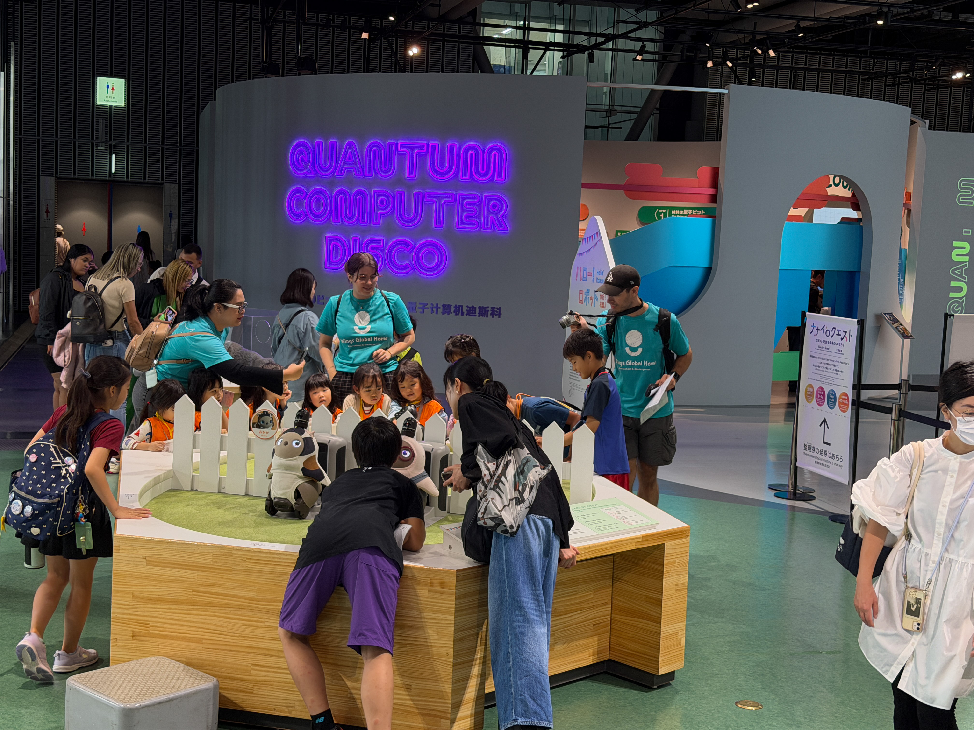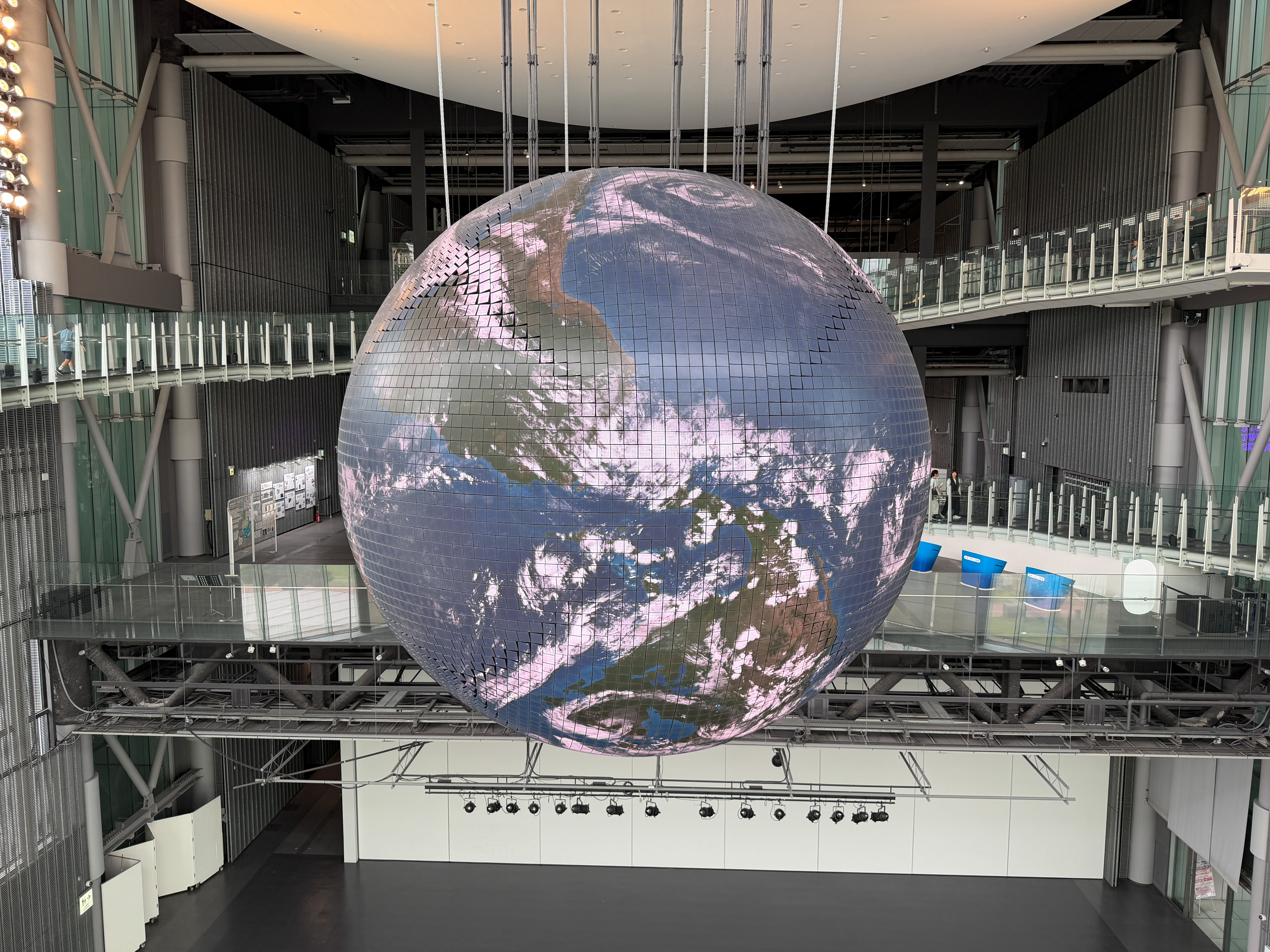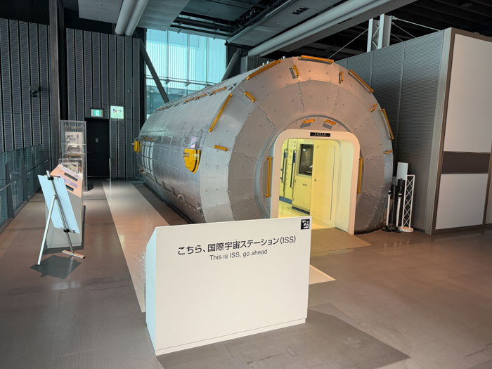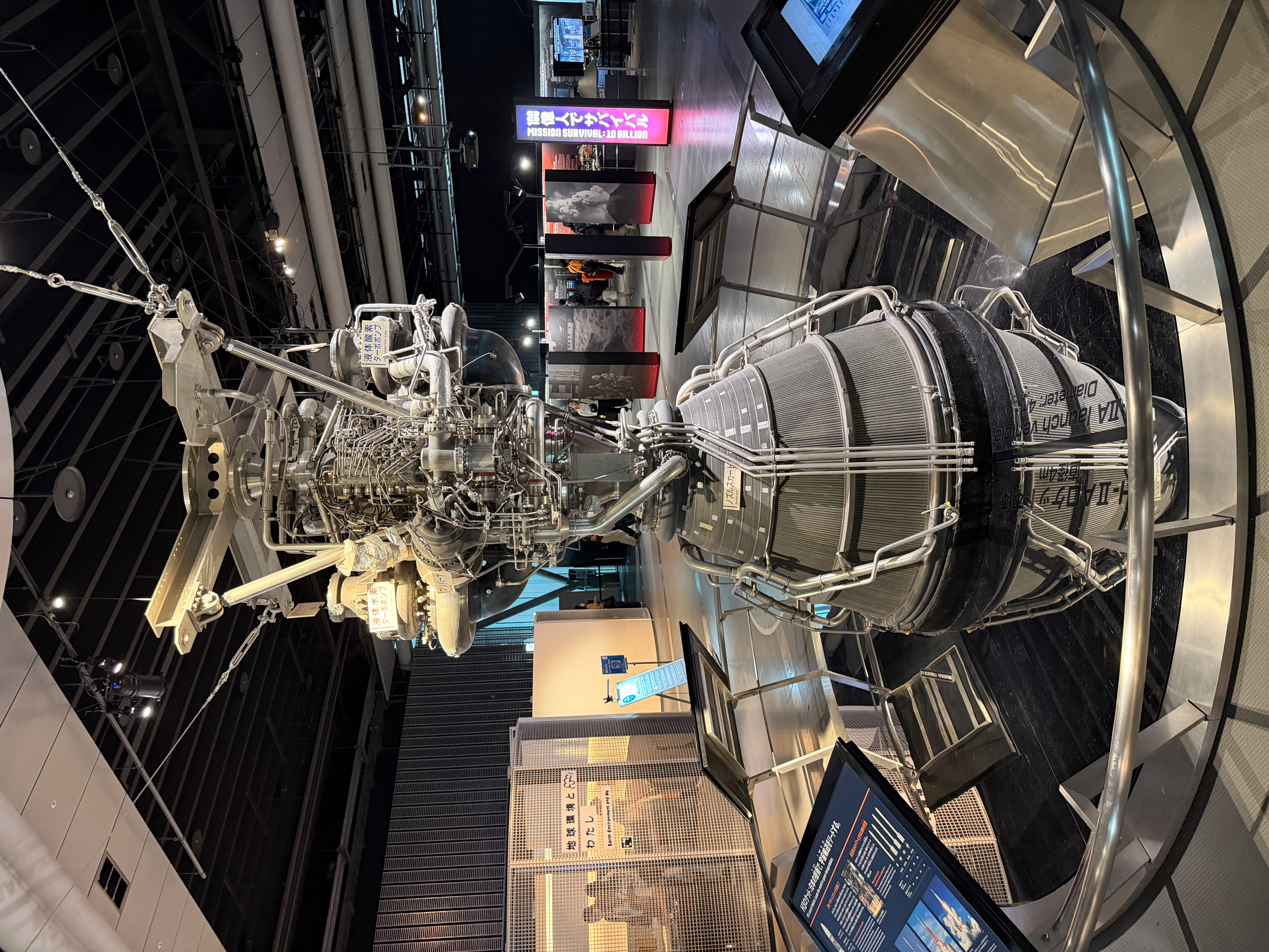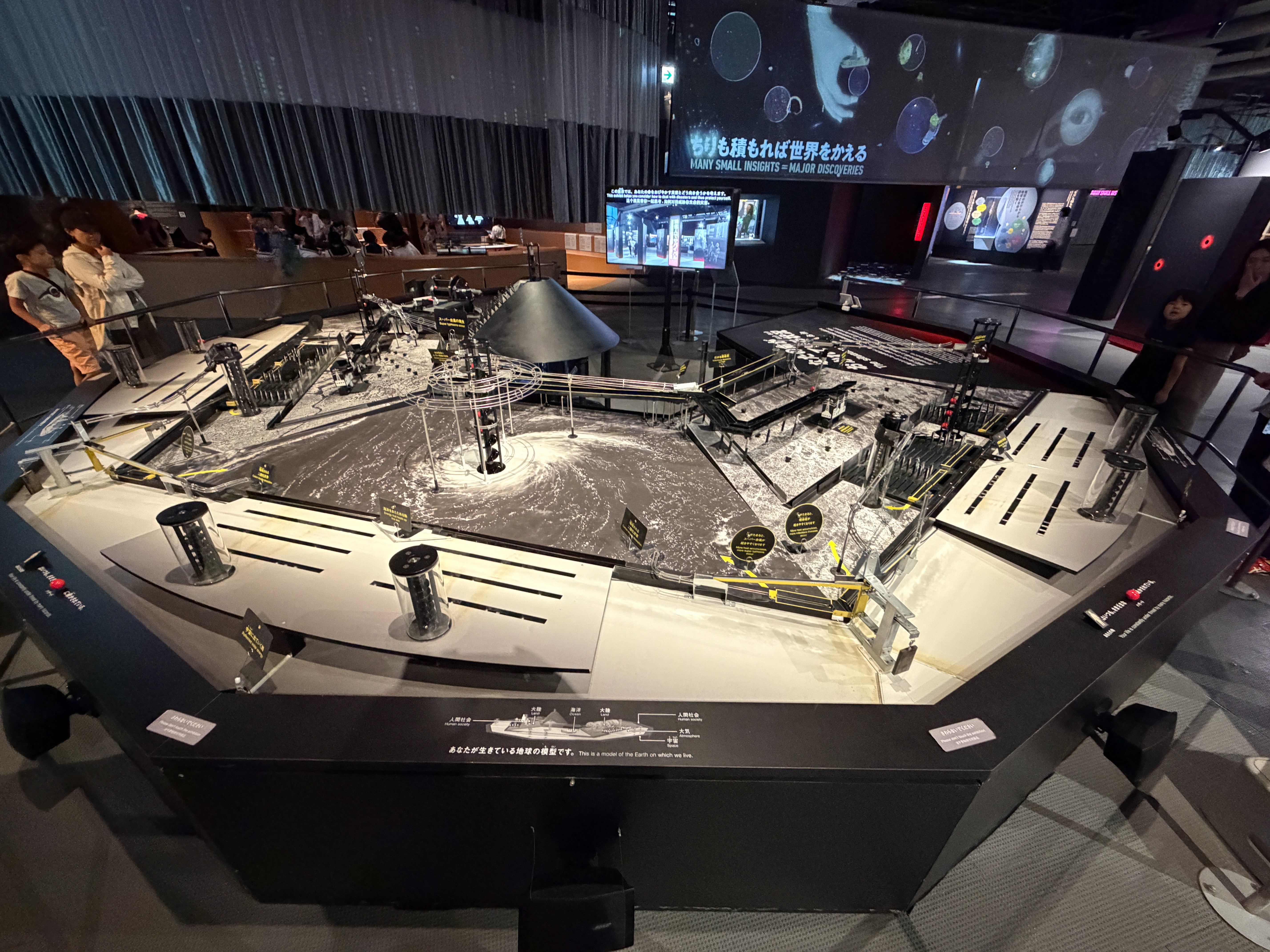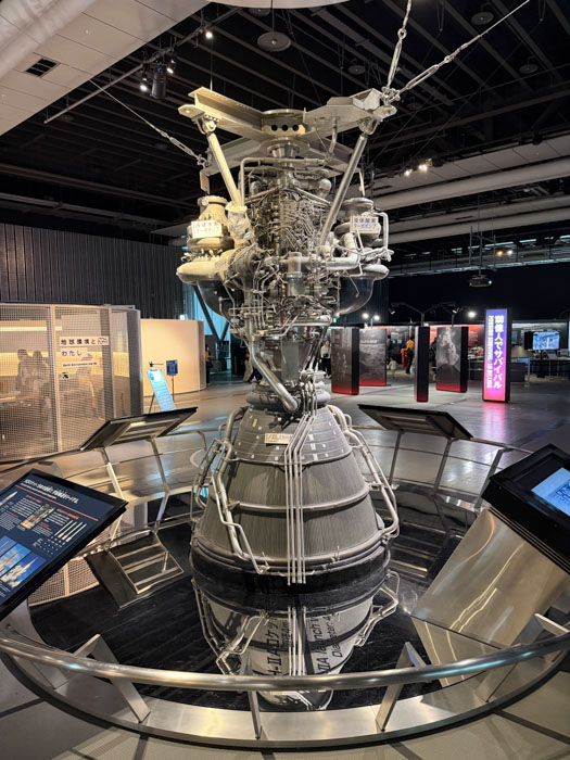 A major feature is a giant globe that shows weather patterns around the world and also at times displays data differences between countries; one I happened to see showed life expectancy differences. There is a section in which you can interact with small robots and exhibits about artificial intelligence. There is a section called the "Quantum Computing Disco," and I had no idea what that was about. There is a replica of a space station module and an exhibit about Japan's space program that is centered around their two workhorse rockets, the H-2 and H-3, including a complex rocket engine from the former. There were exhibits about deep-sea core drilling, biological cell development, and of course global warming. There was also a very elaborate mechanical display that wanted you to think about the hazards of technology and particularly carbon emissions. It featured large ball bearings moving around randomly on tracks and red balls that would slide randomly through a bunch of people silhouettes and mow them down.