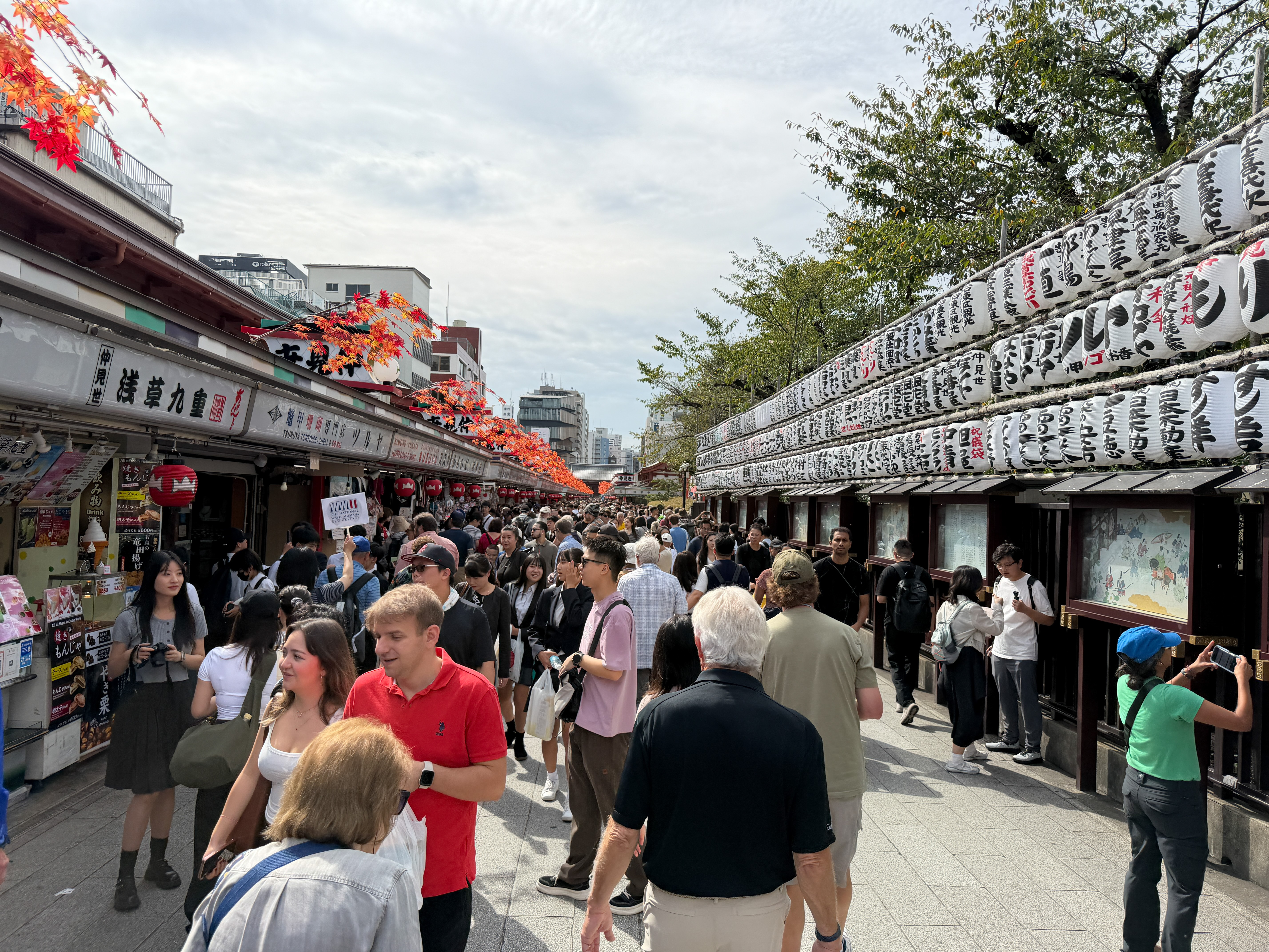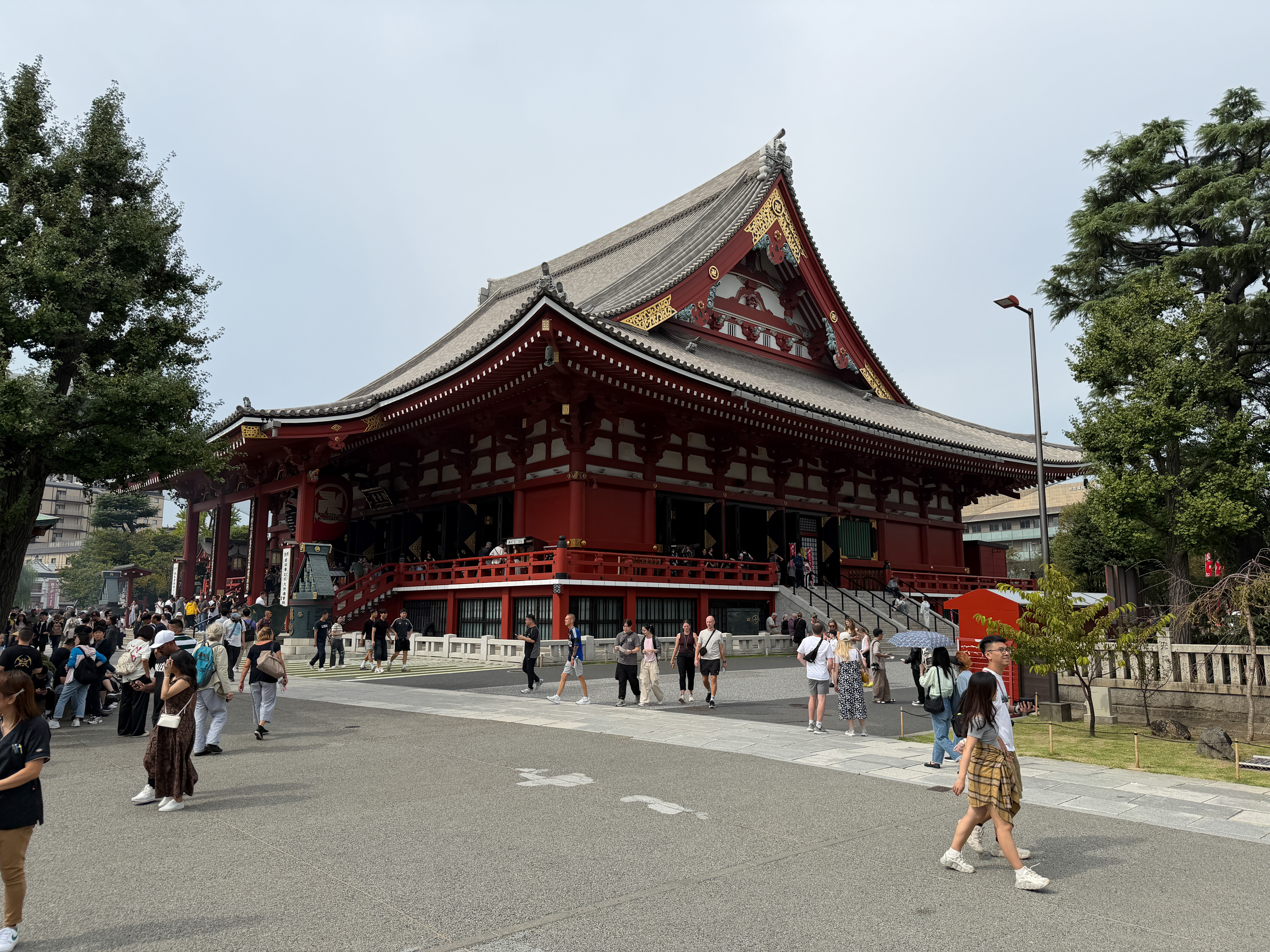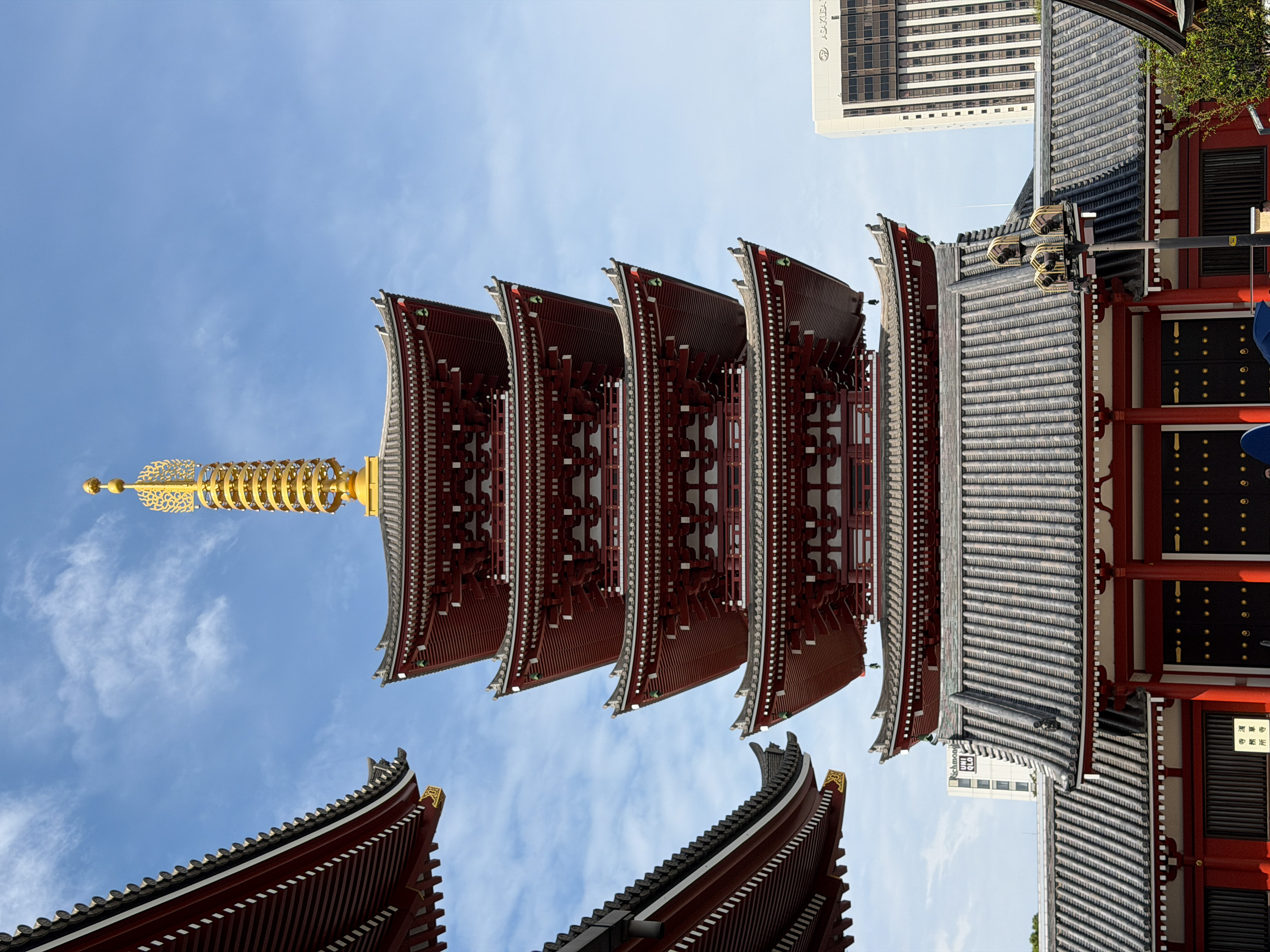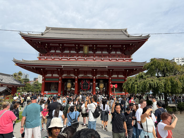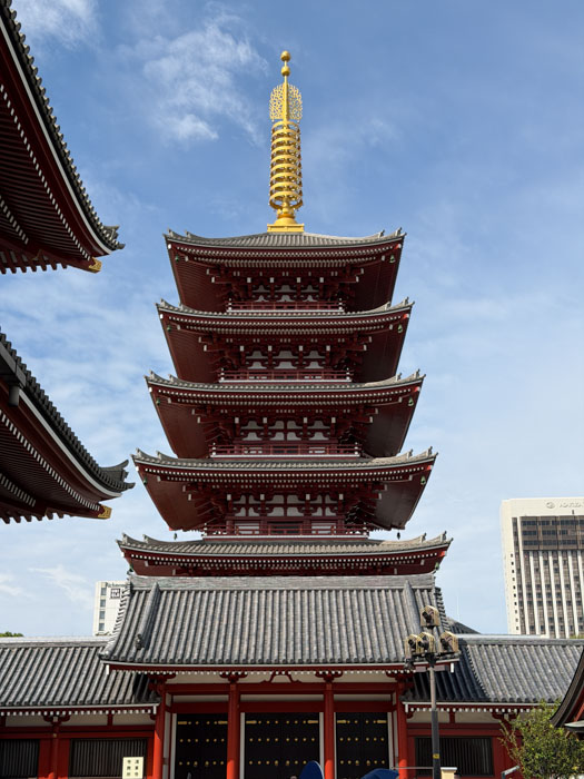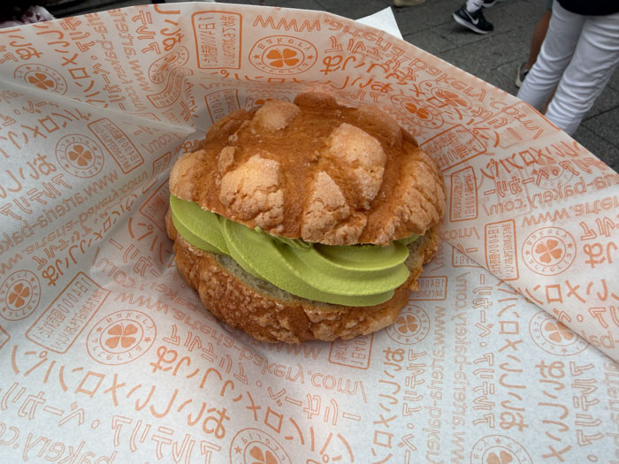 There is a narrow street, Nakamise-dōri, extending 250 m that is crammed with 72 touristy shops. It has origins from the 12th century but was rebuilt to western standards in the 19th. My lunch here was from various shops serving street food, which had to be consumed standing next to the shop; Japanese culture frowns on walking while eating. I had a “melon bun” with matcha ice cream, a churro, and a fried cake made of meat, potatoes, and cheese.