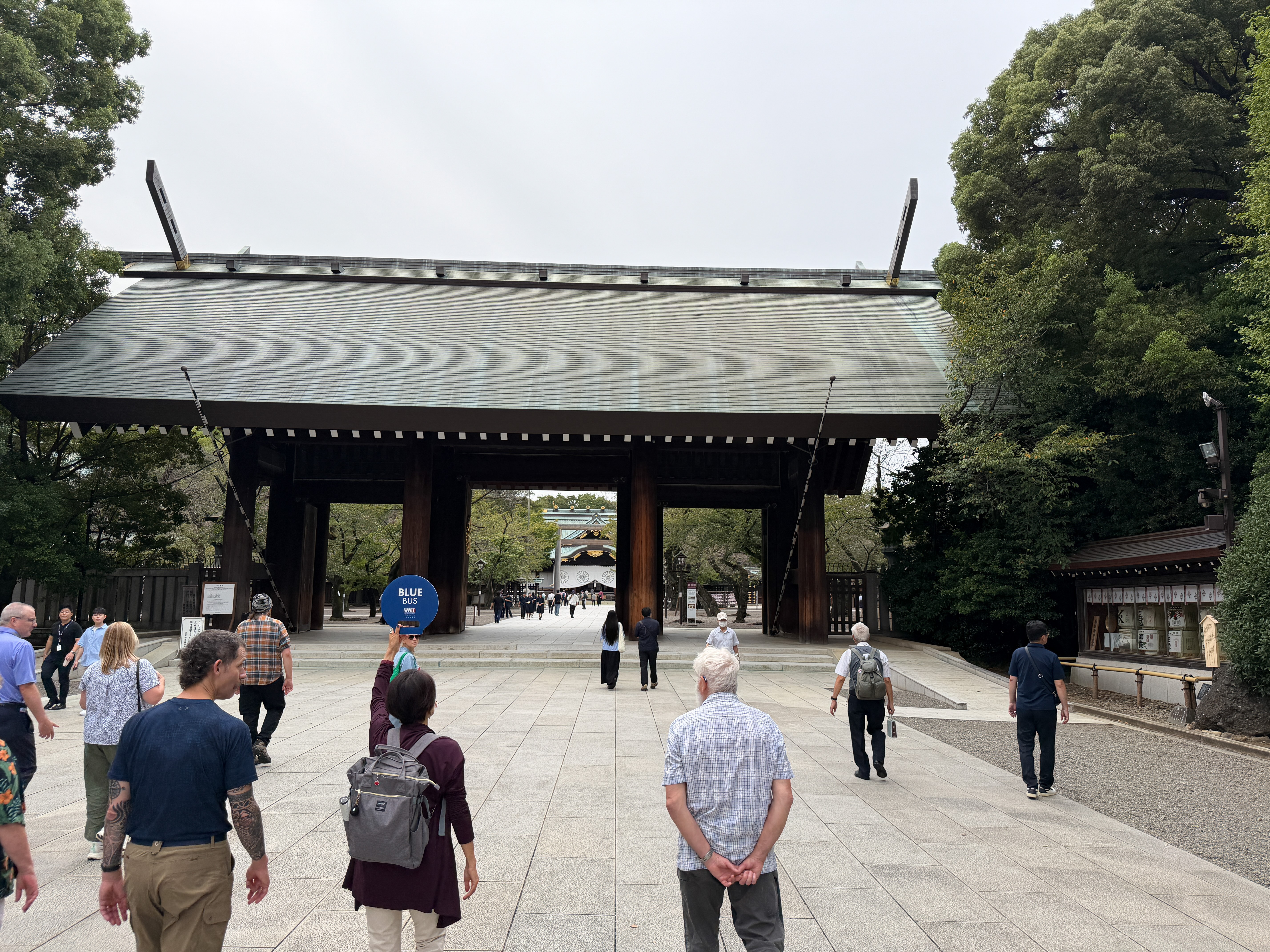 This morning, we had an interesting task: We had to turn in our checked luggage for transport to Hiroshima separately from the bullet train that we will be taking Saturday morning. The luggage truck will have at least a 10-hour drive. We have a different bus today, and I nabbed a seat meant for wheelchairs, I think, which had superlative legroom! James Fenelon rotated onto our bus as the historian of the day.