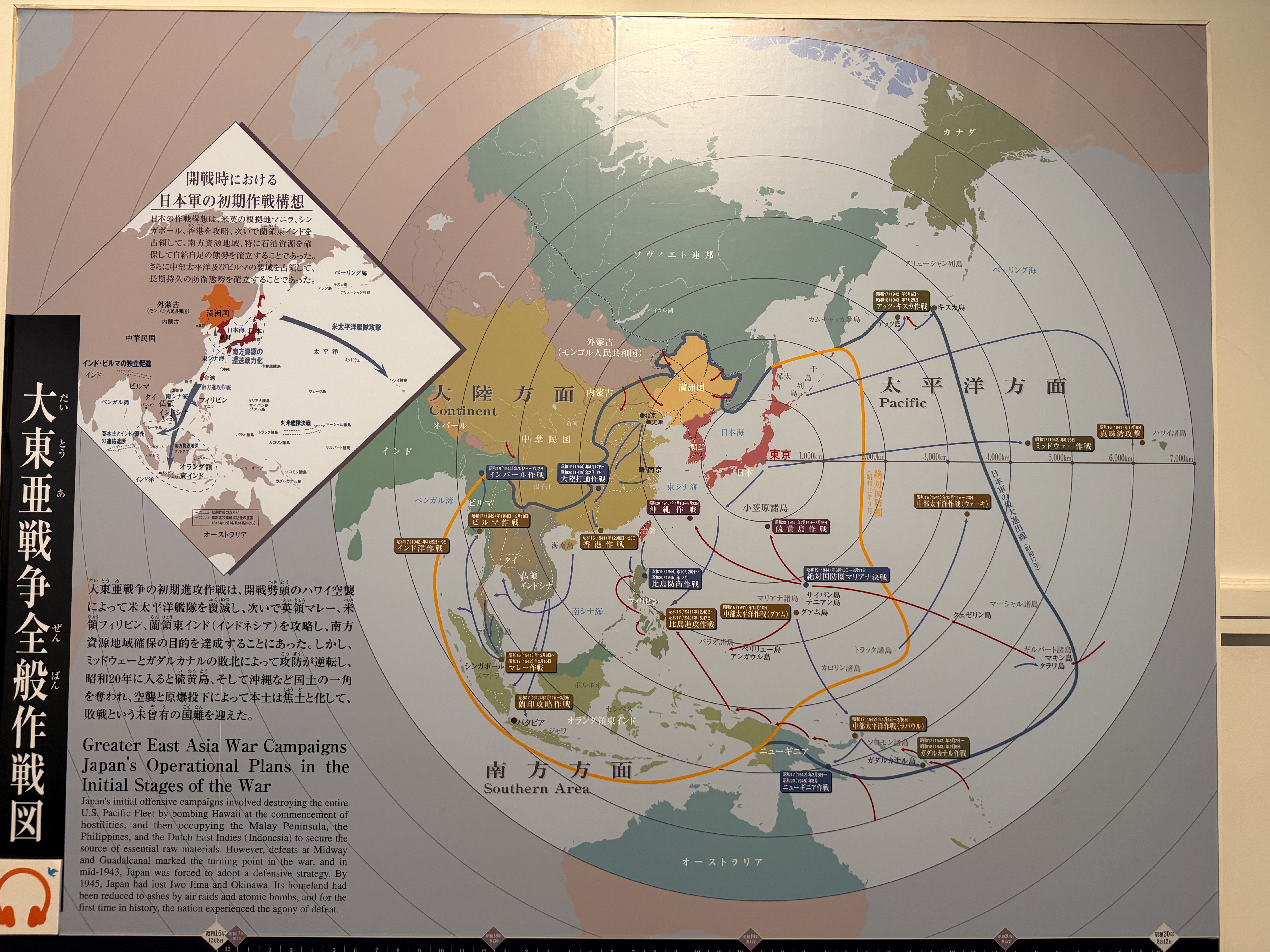 Next was Yūshūkan War Museum, which is situated within Yasukuni Jinga Shrine, established in 1869, at the start of the Meiji Restoration. The museum, which originally opened in 1882, is quite modern and stylish, and it has some English captions on exhibits. Unfortunately, many of the interesting history exhibits are in rooms where photographs are prohibited. I did manage to sneak one of a Pacific campaign map; I found the cartography to be excellent throughout, although the maps were almost exclusively labeled in Kanji. The museum covers the military history of Japan from the swords and armor of the samurai era (briefly) up through the end of WWII. Roomfuls of exhibits are presented about the opening of Japan by Commodore Perry, the period of modernization of the economy and military, the samurai rebellions during the Meiji Restoration, visits by imperial families to the shrine, the Sino-Japanese War, the Boxer Rebellion, the Russo-Japanese War (highlighted by an excellent film with subtitles), Japan in WWI, the Chinese Incidents (which is what they call all of their aggression in China through the 30s), and then a very extensive history of WWII.