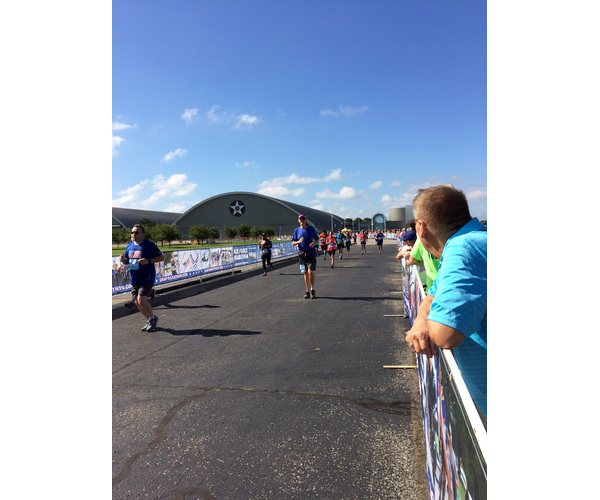Race Day. I was very concerned about getting to the race with a minimum of inconvenience for Nancy. The organizers offered a shuttle bus from near the hotel, but the last one left at 6 AM, which is way too early for an 8:30 AM start. They recommended arrival 90 to 120 minutes before our race, which seemed excessive, but it actually turned out that 90 minutes was on point. The parking area was well over a mile from the starting line near the museum. Nancy stayed with the car because the exits were closed until 8:30, the start time for the half; the full was at 7:30, 10K at 8:00. The morning started out with heavy low overcast and cool temperatures, absolutely perfect running weather. There were ceremonial overflights of a giant C-17 Globemaster III, but they were invisible because of the weather. There was also supposed to be a dramatic parachute team drop, but it was canceled. Nancy revisited the museum (open at 9 AM) while I ran.