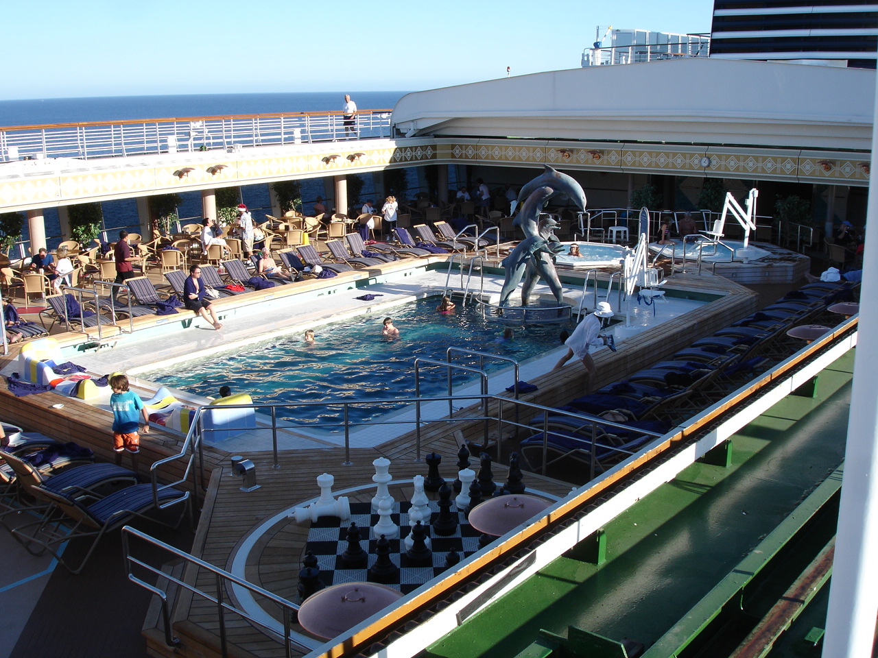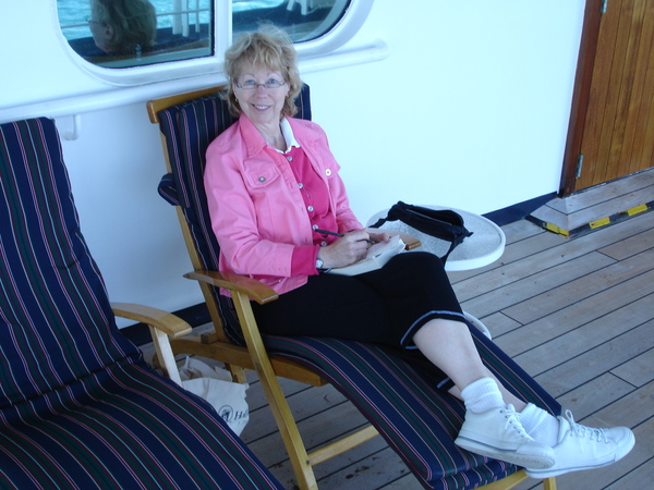 We watched from the restaurant, and later from our balcony, hundreds of dolphins jumping alongside the ship. Nancy attended a cooking demonstration (they have a well-equipped cooking theater and offer classes during the week) while I read. Having lengthy periods to catch up on reading is one of the activities I really enjoy on cruising. We both took a brisk two-mile walk on the lower promenade deck, which was something we tried to do almost every day.