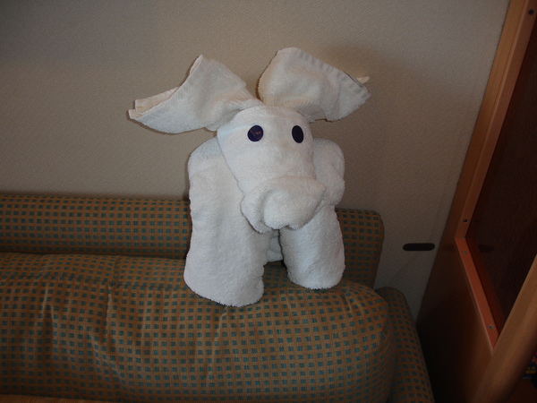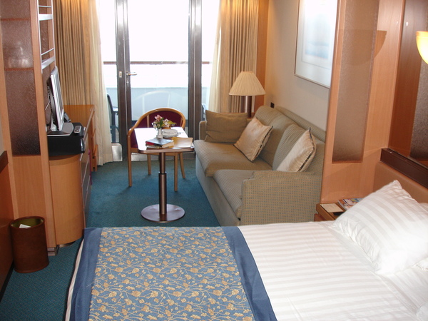 We booked one of the few cabins on this ship with a veranda, on the Navigation Deck (deck 10) just behind a long row of large suites. Our cabin was quite spacious in comparison to previous cruises and well laid out with nice fixtures, a large bathroom that had a small whirlpool tub, a small but adequate balcony, large LCD TV set with the DVD player, and a minibar. Our cabin steward was friendly and efficient throughout the cruise. He delighted us by creating little sculptures from folded bath towels, such as an elephant and a goofy horse (or perhaps it was a cow). And every time we left the cabin, he seemed to pop up like a prairie dog and greet us by name.