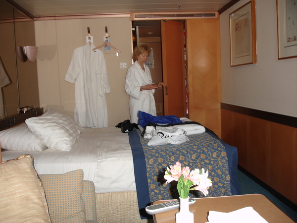 We attended the sailaway party and explored the ship. The Ryndam is one of three HAL sister ships (they call their full fleet of ten the "Dam Ships"—ho-ho) that focus on the midsized market, with about 1250 passengers. This sounds like a lot (and certainly is in comparison to Windstar's 140), but is only one third the size of some cruise ships. The public areas were quite nice, although it appears as if they had multiple interior designers who were not coordinating with each other. The main show room was gaudy, sort of like Art Deco on crack. There was a large library with hundreds of books, games, DVDs, an espresso bar, and Internet access—from workstations and also wireless. (I purposely decided to avoid Internet contact during the cruise and did not bring my laptop. I am moderately happy about that decision because I heard a number of complaints about the Internet service at sea. It was apparently quite slow and rather expensive: access was $.75 per minute or in a package of 250 minutes for $100.)